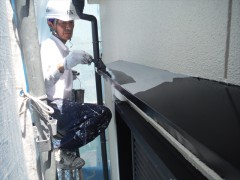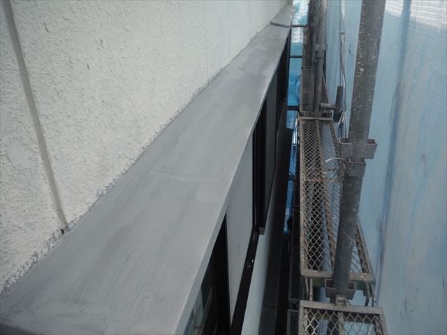 - 屋根、外壁の高圧洗浄が完了し錆止め塗料で庇を塗装しています。