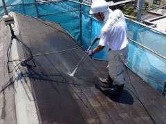 - 高圧洗浄した屋根は、まず棟板金を錆止め塗装しておきます。