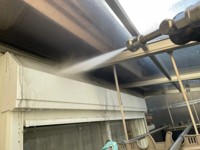- 足場解体完了後カーポート全体的に洗剤をつけます。