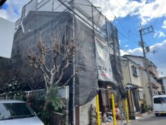 - 足場組ができ飛散防止シートを張り付け作業にかかります。
