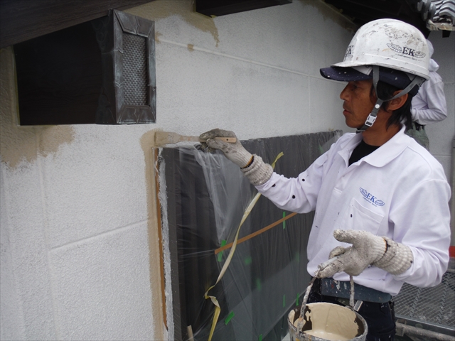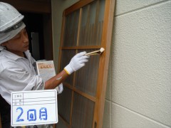 - 下塗り乾燥後、窓廻りから刷毛で塗っていきます。上塗りは『EC-2000F』を使用しました。