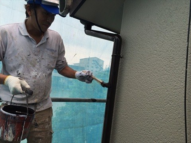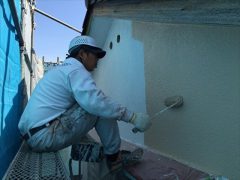 - 外壁の下塗りはカチオンシーラーです。たっぷりと塗っていきます。カチオンシーラーは密着力に優れています。
